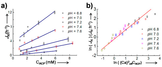 Nucleation rate, JN, was related to (a) the amount of precipitated amorphous calcium phosphate (ACP) (CACP, mM) and (b) effective calcium activity ({Ca2+}, mM). Reproduced with permission from the Royal Society of Chemistry in Reference [10].