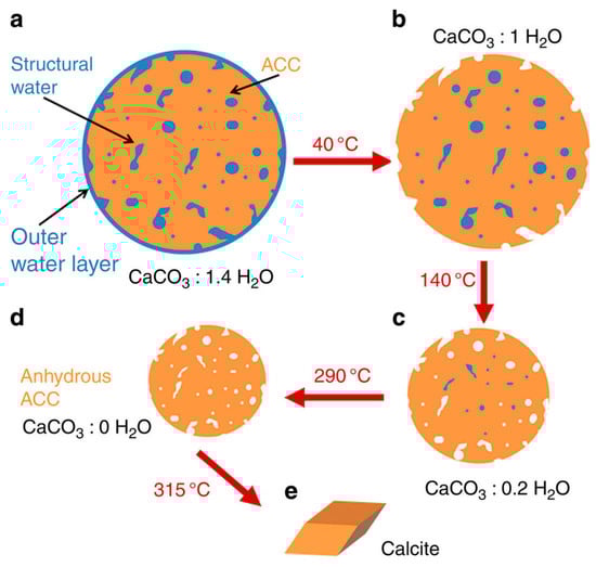 Schematic of stages of ACC dehydration. The solid-solid transformation is followed by water dehydration of ACC. Upon going from a to b, surface-bound water is lost, during b to c water is lost from the interior of the ACC and the ACC particle shrinks. Going from c to d, the most deeply located water is expelled, and from d to e, crystallization to calcite occurs. Reproduced with permission from Macmillan Publishers Limited in Reference [57].