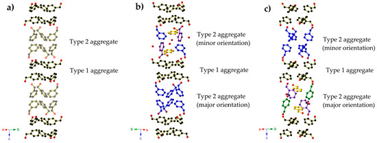 In the Co2(BzOip)2(H2O)·0.19H2O crystals from aqueous ethanol, the second aggregate of benzyl groups contains one major (shown in blue in Figure 3b) and three minor orientations. The three minor orientations are related by three-fold rotation in the ab-plane, and contain two benzyl groups from the major (blue) orientation, and two of each of the minor orientations of the benzyl group (shown in purple and yellow in Figure 3b). Whilst the major orientation of this aggregate results in a hexaphenyl embrace between the benzyl groups, the minor orientations contain a tetraphenyl embrace [30] between the benzyl groups coloured blue and purple in Figure 3b. Partial occupancy water molecules located near to this aggregate and the major orientation of the benzyl groups are positioned such that they are mutually exclusive, and the presence of the water molecules disrupts the hexaphenyl embrace of the major orientation. The ratio of the major to minor orientations of this aggregate are approximately 80:20. A close-up view of the minor orientation is shown in Figure 4a.