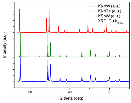 XRD patterns of KNbW, KNbTe and KSbW at 298 K, characteristic of a single-phase, cubic pyrochlores. The progressive shift to higher 2θ angles stands for unit-cell parameter reduction.