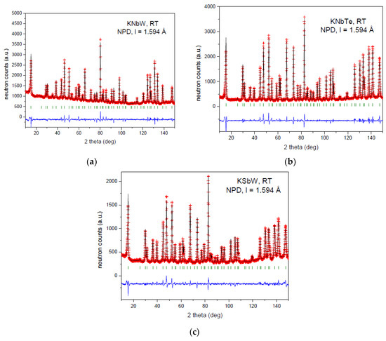 The crystal structures were refined by the Rietveld method [18] with the software FULLPROF (Grenoble, France, version Nov. 2016) [19]. The coherent scattering lengths of K, Sb, Nb, Te, W, O and H were 3.67, 5.57, 7.054, 5.80, 4.86, 5.803 and −3.739 fm, respectively. For generating the line shape of the diffraction peaks a pseudo-Voigt function was chosen. In the final Rietveld fit the following parameters were refined: scale factor, background coefficients, zero-point error, pseudo-Voigt profile function parameters corrected for asymmetry, atomic coordinates, anisotropic atomic displacement parameters for all atoms, and the occupancy factors of certain atoms.