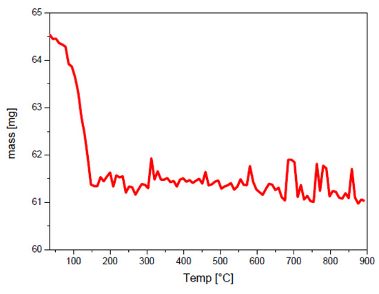 Thermogravimetric analysis (TGA) curve was obtained using a Stanton STA 781 instrument, (London, UK). The temperature was measured with an accuracy of ±1 K. Analysis was carried out in an air flow at a heating rate of 10 K·min−1. About 64.5 mg of powder sample was used.