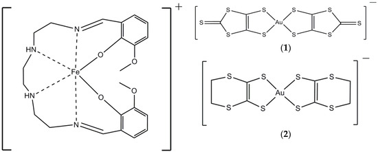 Scheme of the cation [Fe(3-OMesal2-trien)]+ and anions [Au(dmit)2]− (1), [Au(dddt)2]− (2).