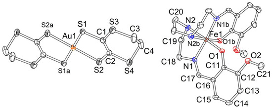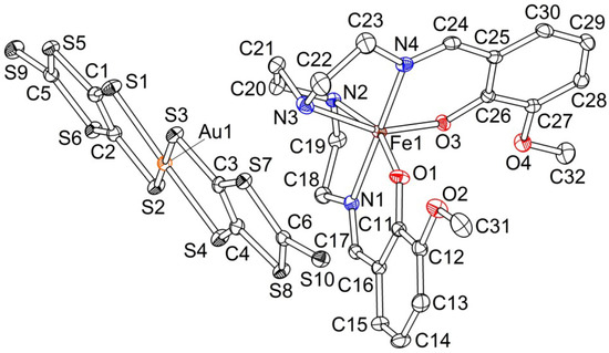 Complex 2 crystallizes in the monoclinic space group I2/c. Asymmetric unit includes a half of the [Au(dddt)2]− anion with Au at an inversion center, a half of the [Fe(3-OMesal2-trien)]+ cation with Fe on a two-fold axis (Figure 6) and an acetonitrile molecule in a half-occupied general position near a two-fold axis. The structure of 2 was investigated at 120 and 293 K. Symmetry of the crystal is the same at both temperatures; however, some important structural changes are observed.