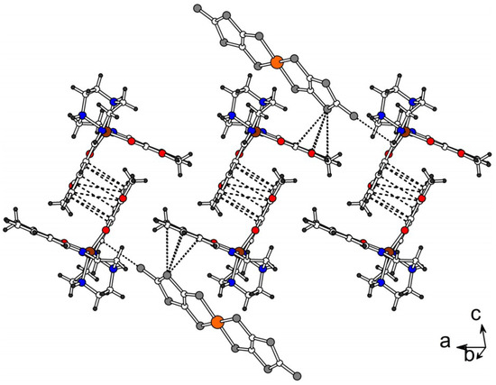 In the structure of 2 the layers of the [Au(dddt)2]− anions alternate with the layers of the [Fe(3-OMesal2-trien)]+ cations along c (Figure 7a). The anion layer is shown in Figure 7b. Solvent molecules are sited in the cation layer (Figure 7c). The length of the double C=C bond in dddt is equal to 1.339(2) Å, i.e., the charge of the dddt part in the [Au(III)(dddt)2]− anion is 2−. There are no stacks in the anion layer because the anions are located near orthogonally to each other.