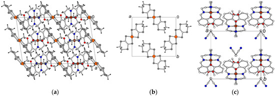 (a) Structure 2 (120 K) projected along b. Solvent molecules located in the cation layer are omitted for clarity. (b) View of the anion layer along c. (c) View of the cation layer along c (H-atoms are omitted).