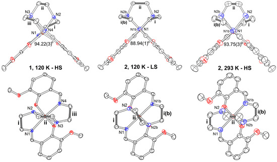 Molecular conformation of the [Fe(III)(3-OMesal2-trien)]+ cation in 1 at 120 K (left), in 2 at 120 K (middle) and 293 K (right), side (upper row) and top (bottom row) view. Symmetry code: b (−x, y, 0.5 − z). The values of α angles between the salicylidene groups are given in the figure. The angles between C–C lines of ethylene groups i, ii and iii are listed in Table 2.