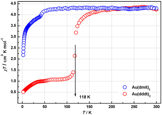 Temperature dependences of the product χT↓ for complexes 1 and 2 are depicted in Figure 9. The measurements were performed on fresh crystals while cooling in the range of 300→2 K, H = 100 Oe. The χT↓ value of 1 starts at 4.26 cm3 K/mol, remains unchanged till 50 K, undergoes the inflection at Ti1 = 46 K, and then decreases continuously down to 2.79 cm3 K/mol. Polycrystalline powder of 2 demonstrate a sharp SCO transition at Tsco = 118 K, during which the χT↓ value changes from 4.25 cm3 K/mol at 300 K (HS) down to 1.07 cm3 K/mol at the plateau in the vicinity of 60 K (LS). The shape of the transition curve was reproduced in several same-day subsequent measurements. Evolution at longer time exposures is discussed below. Hysteresis behavior was not observed between χT↓ and χT↑ curves in the transition range. In the vicinity of Ti2 = 55 K there was also a slightly pronounced inflection below which χT decreases down to 0.51 cm3 K/mol. The χT values at 300 K of both compounds are consistent with the theoretical spin-only value of 4.375 cm3 K/mol corresponding to 100% amount of HS Fe(III) ions, S = 5/2, g = 2.0. This is also in agreement with the assertion that both anions Au(dmit2)− and Au(dddt2)− do not have magnetic moment.