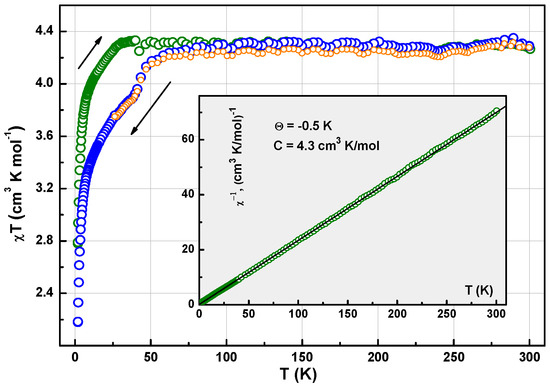 Temperature evolution of χT in warming (○) and cooling (○, ○) regimes. Inset: Plot χ−1(T)↑ vs. T in 1. Solid line is Curie-Weiss fit with C = 4.3 cm3 K/mol and Θ = −0.5 K.