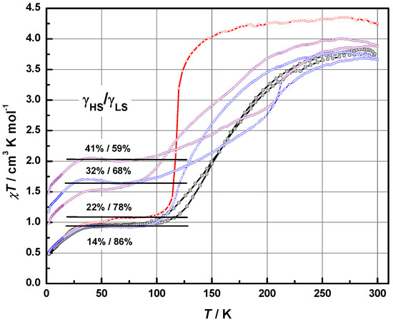 Temperature evolution of χT for aged crystals 2: initial curves χ(T)↑↓ (○), γHS = 14%, first warming-cooling cycle (○), γHS = 32%, second cycle (○), γHS = 41%. Solid red line is a reference curve for fresh crystals from Figure 1.