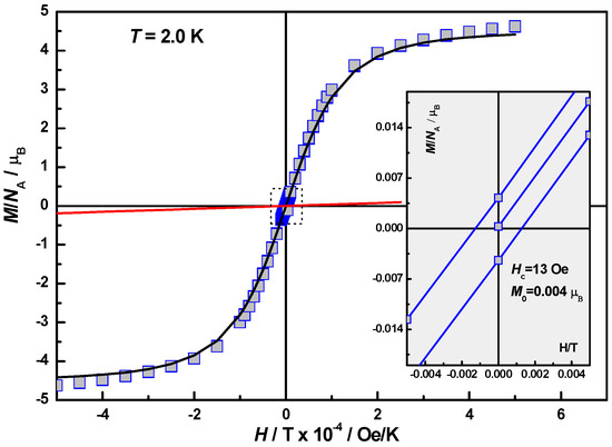 Field dependence of the magnetization, M(H), in 1 at T = 2.0 K. Solid black line is a Brillouin function for S = 5/2 and magnitude factor 0.9. Solid red line fits the difference between experimental curve and Brillouin fitting. Inset: Near zero-field segment of the hysteresis loop with Hc = 13 Oe and Mr = 4 × 10−3 μB.