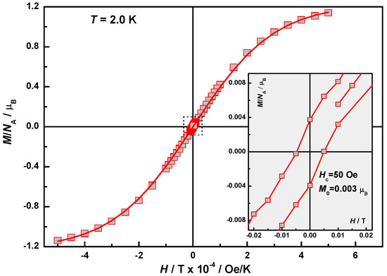Field dependence of the magnetization, M(H), in 2 at T = 2.0 K. Solid line is a Brillouin function for S = 1/2 and magnitude factor 1.23. Inset: Near zero-field segment of the hysteresis loop with Hc = 50 Oe and Mr = 3 × 10−3 μB.
