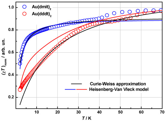 Temperature dependences of normalized χT for HS fractions in 1 (○) and 2 (○). Solid lines are the best fit curves for the two models: Curie-Weiss law (black line) and Heisenberg-Van Vleck model (blue and red lines, see details in the text).