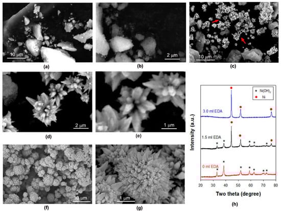 SEM images (a–g) and XRD patterns (h) of the products formed in 200 mL of 15 M NaOH solution containing different amounts of EDA: (a,b) 0 mL, (c–e) 1.5 mL, and (f,g) 3 mL. Reaction duration is 2 h.