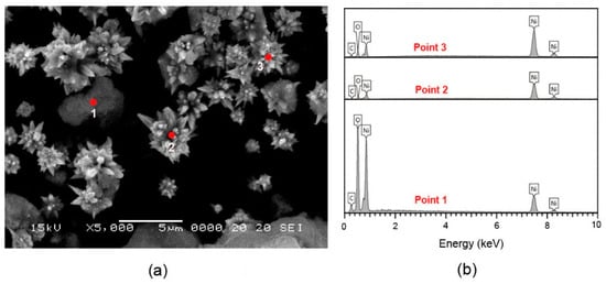 The XRD analysis hints that the product formed in the presence of 1.5 mL EDA is a mixture of Ni(OH)2 and Ni. Since the morphology of block-like materials in Figure 1c is similar to that of the Ni(II) precursor in Figure 1a, we speculate that the block-like materials in Figure 1c are Ni(II) precursors, and thus the microflowers should be Ni. To confirm this inference, the EDS analysis of the block-like materials and microflowers is provided in Figure 3. Point 1 in Figure 3a belongs to the region of a block-like material and its EDS spectrum indicates the presence of a large amount of oxygen with the weight percentages of Ni, O, and C being, respectively, about 55.1%, 34.4%, and 10.5%, suggesting that block-like material is an Ni(II) precursor. Points 2 and 3 in Figure 3a belong to the regions of microflowers, and their EDS spectra reveal that these microflowers are dominantly composed of Ni, with the weight percentages of Ni, O, and C being, respectively, 95.7%, 1.5%, and 2.8% on Point 2 and 93.7%, 2.8%, and 3.5% on Point 3. These observations confirm that the microflowers formed in the presence of 1.5 mL EDA are Ni microflowers. To understand whether these microflowers will evolve into microspheres after all Ni(II) precursors are reduced to Ni, we prolonged the reaction time from 2 h to 6 h. The XRD pattern of the resulting product (Figure 4a) clearly indicates that Ni(II) is completely converted into Ni. However, the SEM images of the product at different magnifications (Figure 4c,d) reveal that the grown Ni microparticles still own a microflower-like morphology, rather than the microspheres as observed in the presence of 3 mL EDA. These results suggest that the morphology of the Ni nano-micro structures can be adjusted by changing the amount of EDA.