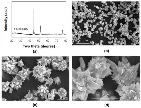 Nano-micro structured materials, a type of material with multi-scale structures that range from nano- to micro-length scales, have shown potential applications in many fields [], including superhydrophobic surfaces, optics, and electrochemistry [,,,,,,]. For example, Yue et al. have reported that nano-micro spherical β-Ni(OH)2 shows excellent electrochemical properties []. A similar result has also been observed by Zhang et al. []. Rajeshkhanna and Rao have found that nano-micro structured Co3O4 possesses a good performance for electro-oxidation of methanol []. Geng et al. observed an interesting transition from superhydrophilicity to super-hydrophobicity on a surface with Ni micro-nano cones array []. Dudem et al. even found that a nano-micro structured silicon surface exhibited both omnidirectional antireflection and superhydrophilicity []. In view of these promising applications, it is important to develop methods for the synthesis of nano-micro structures. In this work, we present a study on the EDA-mediated synthesis of Ni nano-micro structures, namely microflowers or microspheres assembled from nanosized horns, via a solution reduction route in concentrated alkaline solution. Unlike the synthesis of Ni nanostructures or nano-micro nanostructures in an alkaline solution of low concentration in the presence of polyvinyl pyrrolidone, cetyltrimethylammonium bromide, or potassium sodium tartrate [,,,], the use of EDA in high concentrated alkaline solution is inspired by our previous work on the synthesis of Cu nanowires [] and hierarchical Cu structures []. The present work mainly focuses on two aspects: (i) The effect of both EDA and NaOH on the reduction of Ni(II) to Ni and the morphology of the resulting Ni products, and (ii) the growth mechanism of these Ni nano-micro structures.