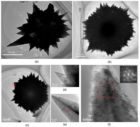 To unveil the microstructures of as-formed Ni nano-micro structures, TEM investigation of the microflowers or microspheres is depicted in Figure 5. It is obvious that the nanosized horns in both microflowers and microspheres possess a solid structure, rather than a hollow one (Figure 5a–c). However, a microsphere contains much more nanohorns than a microflower, which is consistent with the observation by SEM. A close examination of a nanohorn (see the framed region in Figure 5c) clearly indicates the existence of ridges in the nanohorn (pointed by arrow in Figure 5e), suggesting that the nanohorn is not a circular nanocone. The high resolution TEM image of the tip of this nanohorn is shown in Figure 5f. The reduced fast Fourier transform (FFT) image of the framed region (inset of Figure 5f) suggests that the nanohorn grows along the <1-10> direction, which is similar to the growth feature of Cu nanowires [] or Cu nanocusps [] under similar experimental conditions. In the growth of Cu nanowires [] or Cu nanocusps [], one of the roles of diamine is to induce an orientated growth, namely acting as capping agent. Kim et al. have found that the capping effect of EDA in the growth of Cu nanowires stems from selective surface reactivity increased by surface oxide removal, namely EDA can inhibit the formation of Cu oxide on the Cu(111) surface, and thus increase the rate of atomic addition to (111) facets at the end of a growing nanowire relative to (100) facets on the sides of a nanowire []. Therefore, it is expected that EDA plays a similar role in the growth of Ni nanohorns.