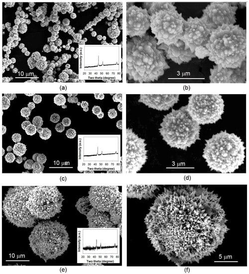 Figure 6 presents the SEM images of the products formed in the presence of 3 mL of EDA in 200 mL NaOH solutions of different concentrations. To complete this reduction, the reaction duration varies from case to case. As shown in the insets of Figure 6a,c,e, all the diffraction peaks appearing in the XRD patterns of the products formed in NaOH solutions of different concentrations can be indexed to fcc structured Ni (JCPDS 87-0712), hinting that Ni(II) is completely converted into Ni. It is clear from these SEM images that the products grown in different concentrations of NaOH have a similar morphology, namely microspheres assembled from nanohorns. However, the size of these Ni microspheres increases as the concentration of NaOH decreases, especially when 5 M NaOH is used. For example, the diameter of the nano-micro structured Ni microshperes formed in 15 M or 10 M is generally lower than 10 μm (Figure 6a–d), but many microspheres with a diameter larger than 10 μm can be observed in the product grown in 5 M NaOH (Figure 6e,f). Two factors, namely the reduction rate of Ni(II) to Ni and the reaction time, are believed to be responsible for the result observed. A low reduction rate of Ni(II) to Ni observed in NaOH of low concentration favors the formation of fewer nuclei via homogeneous nucleation in the early growth stage. Fewer nuclei, along with a longer reaction time, allow these nuclei to grow to a bigger size at the expense of remaining Ni(II) in the reacting mixture.