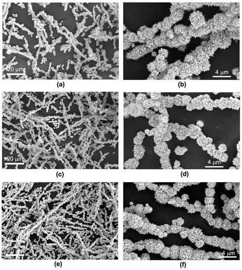 SEM images of the products formed in the presence of 3 mL of EDA in a 15 M NaOH solution of different amounts: (a,b) 100 mL, (c,d) 50 mL, and (e,f) 25 mL. Reaction duration is 6 h.
