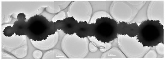 Besides the effect of NaOH concentration, we have also investigated the influence of the amount of NaOH solution on the morphology of the Ni nano-micro structures. Figure 7 presents the SEM images of the products formed in the presence of 3 mL of EDA in a 15 M NaOH solution of different amounts. Interestingly, unlike the isolated nano-micro structured microspheres and their irregular aggregations observed in the case where 200 mL of 15 M NaOH solution was used (see Figure 1e), many chain-like aggregations can be found in the products when the amount of NaOH solution is reduced (Figure 7a,c,e). The high magnification SEM images (Figure 7b,d,f) indicate that these chains are composed of nano-micro structured microspheres, which is supported by the TEM image of a chain resulting from the self-assembly of the microspheres of different sizes (Figure 8). The formation of the microsphere chains is probably associated with the fact that a reduction in the amount of NaOH solution means less room for the growth of these nano-micro structured microspheres. That means there are more chances for these microspheres to connect each other during their growth, and chain-like aggregations form as a result of a reduction in the surface energy of the system. Another important factor that may promote the formation of these chain-like aggregations is the magnetism of Ni. It has been reported that the ferromagnetic nanoparticle chains, e.g., Fe3O4 [] or Co chains [], can be formed via dipolar assembly. Although the size of Ni particles in our case is at the micrometer scale, the similarity between the dipolar structures of the ferromagnetic nanoparticles and the Ni chains observed in our experiment hints that dipolar magnetic assembly should contribute to the growth of Ni microsphere chains.
