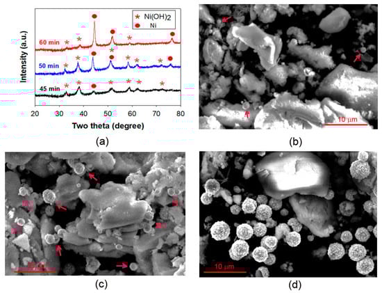 To get an insight into the formation mechanism of these Ni nano-micro structures, we have examined the products formed at an early stage in 200 mL of 15 M NaOH solution containing 3 mL of EDA. The products obtained after reaction for 45 min, 50 min, and 60 min are light green, grey, and dark grey, respectively. The XRD patterns of these three samples (Figure 9a) reveal that two phases, namely Ni(OH)2 and Ni, are present, with the 45 min sample being mainly composed of Ni(OH)2, and the 60 min sample being dominantly in the form of Ni. The morphology of these products is presented in Figure 9b–d. As indicated by arrows in Figure 9b, very few sphere-like particles can be found in the 45 min product. However, many microspheres appear after the reaction for 50 min (see arrows in Figure 9c). When the reaction time reaches 60 min, the product contains a large number of microspheres, whose sizes are obviously larger than those of the microspheres in Figure 9c. Although these observations indicate the growth of Ni microspheres during the reduction of Ni(II), the detail growth mechanism of these nano-micro structured microspheres is still unclear.