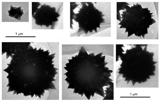 To disclose the growth process of Ni nano-micro structured microspheres, we have also investigated these products by TEM. Figure 10 presents the TEM images of the nanohorn-containing spheres of different sizes found in the products grown in a 200 mL NaOH solution (15 M) containing 3 mL of EDA. From these TEM images, we can roughly observe a growing picture of Ni microspheres in the presence of EDA under strong alkaline conditions, namely from small-sized particles with sparse nanohorns to micro-sized spheres with dense nanohorns. To unveil why more and more nanohorns form during the growth of Ni microspheres, we conducted a close examination of the nanohorn-containing spheres of different sizes by SEM. As indicated by arrows in Figure 11, the nanohorn-containing spheres, whether their sizes are big or small, contain many very small particles lying between nanohorns or on the surface of nanohorns. The finding hints that during the growth of microspheres, heterogenous nucleation, which will produce new nuclei on the surface of the growing spheres, also occurs. These new nuclei may also evolve into nanohorns as a result of orientated growth along the <1-10> direction, which not only will produce more nanohorns in the microspheres, but may also contribute to the diversity in the size of the nanohorns. As already mentioned above, a microflower contains much fewer nanohorns than a microsphere. This implies that during the growth of microflowers the heterogenous nucleation, which may produce new nuclei and thus favors the formation of new nanohorns, seldom happens. More specifically, these observations remind us that orientated growth dominates during the growth of microflowers, but both orientated growth and heterogenous nucleation coexist in the growth of nano-micro structured microspheres. The reason for this might be related to the fact that the amount of EDA used in the growth of microspheres is two times higher than that in the growth of microflowers. It is expected that in the growth of microspheres, the excessive EDA may affect the orientated growth and thus facilitates the heterogenous nucleation.
