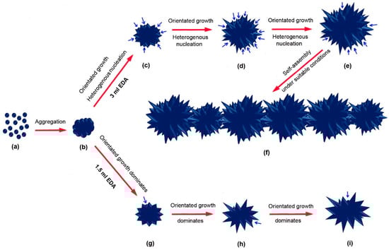 Amines, a class of organic compounds, which contain an amino group with a pair of lone electrons on the nitrogen atom, are widely used for mediating the growth of a variety of nanostructures, including nanocrystals, nanosheets, nanorods, and nanowires [,,,,,,,,,,,,,]. As the simplest diamine after hydrazine, for example, ethylenediamine (EDA) can be used as a capping agent in the synthesis of ultrasmall CeO2 particles [], PbS nanosheets [], Mn3O4 nano-octahedrons [], and CdS multipods [], as a coordination template in the synthesis of CdX (X = S, Se, Te) nanorods [] and ZnS nanowires [], and as both capping agent and complexing agent in the growth of Cu nanowires [,]. In addition, EDA has also been employed in the synthesis of microsized materials [,,]. For instance, EDA can serve as a morphological template for the growth of α-Bi2O3 microrods []. Fe2O3 microspindles have been successfully produced by an ethylenediamine ligand-controlled hydrothermal approach []. Although much work has been done on the EDA-mediated growth of nanostructures, there are few efforts on the use of EDA in the synthesis of nano-micro structured materials.