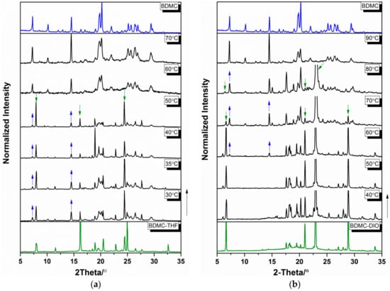 Temperature-resolved powder X-ray diffraction (TR-PXRD) patterns of (a) BDMC-THF (tetrahydrofuran), (b) BDMC-DIO (1,4-dioxane), and (c) BDMC-DMSO (dimethyl sulfoxide). Appearance and disappearance of the characteristic peaks of BDMC and its solvates are indicated by the arrows.