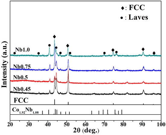 The XRD patterns of the CoCrFeNiNbx HEA coatings are shown in Figure 1. It could be observed that there were two phases, one was an FCC solid solution phase, the other was a Co1.92Nb1.08-type Laves phase in all of Nb0.45, Nb0.5, Nb0.75, and Nb1.0 HEA coatings, which was consistent with the alloys prepared by arc melting [35]. Moreover, the strength of the Laves phase diffraction peaks increased with increasing Nb content, indicating that the volume fraction of the Laves phase increased.