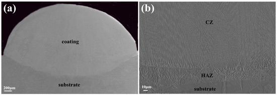 Figure 2 exhibits typical macroscopic morphologies in the cross-section of the HEA coatings. From Figure 2a, it could be found that the coating had good geometry, being uniform and free of cracks and porosity. In addition, no clear boundary existed between the substrate and cladding coating, see Figure 2b, which indicated an excellent metallurgical bonding between the coating and the substrate. The sample could be divided into two parts of coatings, consisting of the cladding zone (denoted as CZ) and the heat-affected zone (denoted as HAZ) from bottom to top.