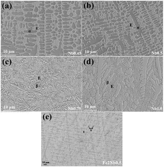 To investigate the microstructures of the CoCrFeNiNbx HEA coatings, the images of the central area in the cladding zone of CoCrFeNiNbx HEA coatings are given, as shown in Figure 3. The Nb0.45 and Nb0.5 alloy coatings presented a typical dendritic morphology, in which the interdendritic region consisted of a lamellar eutectic structure (denoted as E). This indicated that the Nb0.45 and Nb0.5 alloy coatings were hypoeutectic alloys with a primary α phase. However, in arc melting, a full eutectic structure was obtained in the Nb0.45 alloy and a hypereutectic structure was found in the Nb0.5 alloy. It is possible that the cooling rate and the solidification velocity of the laser cladding sample were higher than that of the arc melting sample which did not allow the growth of secondary dendrites. In order to investigate the other reasons, the chemical compositions in different regions were measured by EDS and are listed in Table 2. The results showed that the Fe content in these coatings was higher than that in the designed alloy composition. The reason was that Fe could diffuse from the 304 stainless steel substrate into the HEA coating during laser cladding. The high Fe content in the HEA coatings may be the main reason that the Nb0.45 and Nb0.5 alloy coatings possessed a hypoeutectic structure. To verify the assumption, the enhanced Fe content CoCrFe2NiNb0.5 alloy (denoted as Fe2Nb0.5) was prepared by arc melting, see Figure 3e, and the results showed that the alloy displayed a typical hypoeutectic structure. This demonstrated the higher Fe content in the Nb0.45 and Nb0.5 alloy coatings enhanced the solid solubility of Nb, thereby leading to the extension of the eutectic composition point to a higher Nb content. For Nb0.75 and Nb1.0 alloy coatings, the primary phase changed to the β-phase, this indicated that these samples were hypereutectic. As listed in Table 2, in hypoeutectic Nb0.45 and Nb0.5 alloy coatings, the eutectic region was enriched in Nb, while the primary α-phase was depleted in Nb element and the primary β-phase contained more Nb element relative to the eutectic region. Based on the XRD and EDS analysis results, it was plausible to deduce that the primary α-phase was an FCC solid solution while the primary β-phase might be the Laves phase. The eutectic structure was a mixture of FCC and Laves phases, which was consistent with the results obtained for arc melting. This indicated that the different synthetic methods did not change the crystalline structure of the alloy.