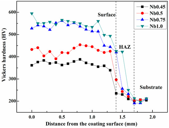 Figure 4 presents a typical Vickers hardness profile of CoCrFeNiNbx HEA laser cladding coatings with different Nb contents. These measurements were made along a straight line from the top of the alloyed layer to the substrate. The effect of the Nb content on the hardness was determined. From the upper surface to the interface of the clad layer, the Vickers hardness value changed very little, which suggested a homogeneous distribution of the phase in the alloy coatings. From Nb0.45 to Nb1.0, the hardness values of these samples were significantly increased, and even reached 385–590 HV, which was 1.8–2.8 times higher than that of the substrate of 205 HV. Wherein, the hardness of Nb1.0was higher than that of the AlxCoCrCuFeNi high-entropy alloys (<550 HV) [41] and the medium-entropy CoCrNi/boride metal matrix composite (467 HV) [42]. In addition, the hardness of the Nb1.0 alloy coating was higher than that of some already used industrial wear-resistant materials, such as high-manganese steel, alloy steel (ZG35Cr2Si1MnMoRE, 5Cr5MoV, ZG22Cr8NiMoTiRE) and Cast Iron. The increased hardness with the added Nb can be explained by the following two major reasons. One was the change of the microstructure of HEA coatings. From Section 3.1 and Section 3.2, it could be found that the microstructure changed from a hypoeutectic structure to a hypereutectic structure, in which the eutectic structure was a mixture of an FCC solid solution phase and hard Laves phase. Since the Laves phase was harder than the FCC phase. The volume fraction of the Laves phase increased with increasing Nb content and thus enhanced the hardness of alloy coatings. Moreover, the eutectic microstructure with a very fine lamellar structure exhibited high hardness. Secondly, the atomic radius of Nb (1.47 Å) is much larger than those of Co, Cr, Fe, and Ni, which are 1.251, 1.249, 1.241, and 1.246 Å, respectively. The large atomic radius of Nb added to the CoCrFeNi alloy would lead to a larger lattice distortion and improve the solid solution strengthening effect. Thus, the Nb0.45, Nb0.5, Nb0.75, and Nb1.0 alloy coatings possessed high micro-hardness values.