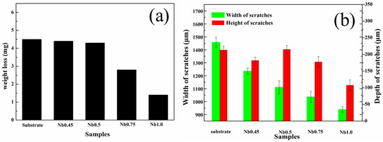 It had been noted that the CoCrFeNiNbx HEA coatings with different Nb contents resulted in the improvement of the hardness value of the substrate. Therefore, these alloy coatings may show better wear resistance compared to the substrate. Usually, wear mass loss and depth/width of wear scar are used as the parameters to evaluate the wear resistance. Small wear mass loss and depth/width of wear scar represent good wear resistance. The wear mass loss of different alloy coatings is shown in Figure 5a. It was found that wear mass loss decreased with the increase of Nb content. The mass loss values in all of the HEA coatings were lower than that of the 304 stainless steel substrate. Among them, the wear mass loss of Nb1.0 alloy coating (1.4 mg) was less than one-third of that of the substrate (4.5 mg). The results showed Nb1.0 alloy coating possessed the highest wear resistance. Ten sets of wear tracks depth and width values were measured by a confocal laser scanning microscope (LEXT) after a sliding test. The average values of the wear scar depth and width are given in Figure 5b. It could be found that the width of wear scar exhibited a downward trend with the increase of Nb content. This was in agreement with the tendency of the weight loss after wear test. It also indicated that wear resistance of the HEA coatings was consistent with Khruschov’s conclusion in which the wear resistance of materials was, in general, proportional to their Vickers hardness [43]. A comparison of the width/depth of the grinding track and the weight loss indicated that the CoCrFeNiNbx HEA coatings showed better wear resistance than that of the 304 stainless steel substrate under the dry sliding condition. Among them, the CoCrFeNiNb1.0 HEA coating presented the best wear resistance.