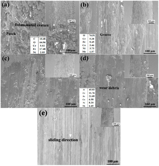 To understand the wear mechanism, it was critical to study the worn surface morphologies. Therefore, a detailed study of worn surfaces was performed using SEM, as shown in Figure 6. From the insert, it could be observed that widths of wear scars of the substrate were obviously wider than that of the CoCrFeNiNbx coatings with different Nb contents. With the increase of Nb content, the widths of wear scars of these coatings decreased. This indicated that wear resistance was improved by the laser surface alloying of CoCrFeNiNbx HEA on the 304 stainless steel. It was obvious that the extent of damage in the substrate sample was higher than the laser cladding coatings. The worn surface of the substrate showed that the whole contact interface presented the characteristics of obvious delaminated craters, large patches, and some white regions, see Figure 6a. The results of the EDS analysis indicated that the white region and the patches were highly enriched in oxygen, indicating that oxidation occurred on the worn surface. The formation of the oxide layer on the worn surface can result in cracking and the peeling-off of materials during dry sliding wear. This implied that there was a combination of adhesive wear, delaminated wear, and oxidative wear mechanisms. It was noted that as the hardness of the ceramic ball as a slider material was larger than that of substrate, this resulted in the transfer of substrate material to the ball surface in the initial stage of the wear test. As the sliding wear test continued, this transferred material may be oxidized during sliding and act as a three-body particle for abrasive wear [19]. The large amount of the alternate delaminated crates (which increases wear weight loss) and adhesive patches (which decrease wear weight loss) on the surface of the 304 stainless steel resulted in the increase in the wear rate. For the laser cladding coatings, the wear surface morphologies were different from the substrate, in which an adhesive wear feature did not clearly exist and they were relatively smoother with shallow grooves. It is noted that a number of shallow ploughed furrows coupled with plastic deformation along the groove, adhesive craters, and some wear debris appeared on the worn surface of Nb0.45 alloy coating shown in Figure 6b. The worn surfaces of the Nb0.5 and Nb0.75 alloy coatings were relatively smoother than the Nb0.5 alloy coating. Delaminated craters and plate-like wear debris also appeared on the worn surfaces. The EDS results showed that the wear debris contained a lot of oxygen, indicating the coating surface was oxidized. The formed oxide layer on the coating surface lead to the formation of shallow abrasive grooves during the sliding. The number of delaminated craters was lower than that in the substrate. Thus, these coatings preserved a lower wear rate than that of the substrate. It could be inferred that the wear mechanism for the Nb0.45, Nb0.5, and Nb0.75 HEA coatings was a combination of abrasive wear, oxidative wear, and delaminated wear. The wear surface of Nb1.0 alloy coating, see Figure 6e, showed a very smooth surface with fine wear tracks aligned in the sliding direction, which resulted from the high hardness. Meanwhile, the oxygen from the environment may play an important role during the wear process. When the chemically active elements (Nb and Fe) were contained in this region, a thin oxide layer formed quickly. The effective lubricating films formed on the sliding surface could escape from the contact regions; thus, reducing the wear of sample. It could be inferred that the wear mechanism for the Nb1.0 coating was a combination of abrasive wear and oxidative wear. These observations revealed that the Nb1.0 alloy possessed the best wear resistance among the tested samples. The improvement of the wear resistance might mainly be attributed to the proper combination of the high fracture toughness of FCC and the high hardness of Laves phases.