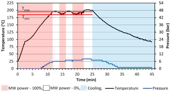 - Continuous microwave heating of the feedstock until the preset maximum temperature is reached (Tmax)—195 °C.
