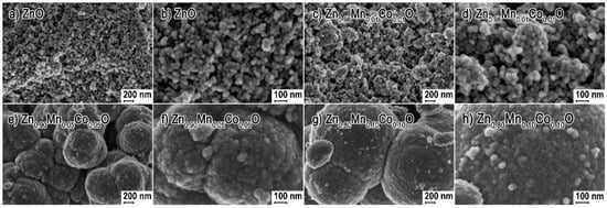 Figure 2 and Figure 3 present selected representative SEM images of Zn(1− x−y)MnxCoyO NP samples. An impact of the content of dopants on the morphology of Zn(1−x−y)MnxCoyO is noticeable. Powders of ZnO and Zn(0.98)Mn0.01Co0.01O were composed of loose homogeneous spherical particles sized 20–50 nm. Powders of Zn0.90Co0.05Mn0.05O and Zn0.8Co0.1Mn0.1O, in turn, were composed of compact homogeneous spherical NPs sized 20–40 nm, which formed conglomerates sized between 1 µm and 3 µm resembling a “cauliflower” in terms of shape and structure. A similar impact of a dopant on a change in NPs morphology was observed in our earlier studies on doped ZnO [,]. In order to eliminate the effect of aggregation of the obtained Zn(1−x−y)MnxCoyO NPs, the synthesis parameters must be individually optimised for each composition of Zn(1−x−y)MnxCoyO NPs. We have shown that microwave solvothermal synthesis permits controlling the size of ZnO NPs aggregates through a change of the microwave power used for ZnO NPs synthesis []. Zhang et al. [] described the impact of a change in the solvothermal synthesis temperature on the size of ZnO NPs aggregates.