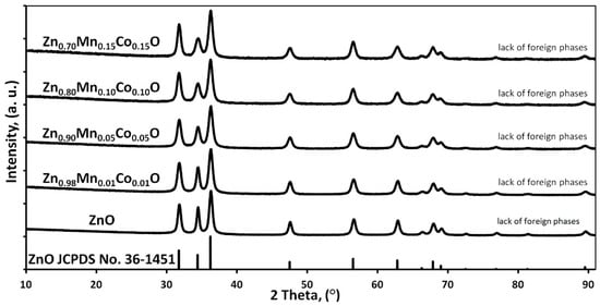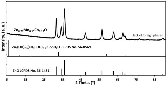 Despite the presence of the lamellar structure visible in SEM images in the Zn0.7Co0.15Mn0.15O sample, all diffraction peaks in Figure 4 were attributed exclusively to the hexagonal phase ZnO (JCPDS No. 36-1451). The XRD test did not show the presence of the secondary phase, which could be M5(OH)(10−z)(CH3COO)Z·nH2O (lamellar structure) [].