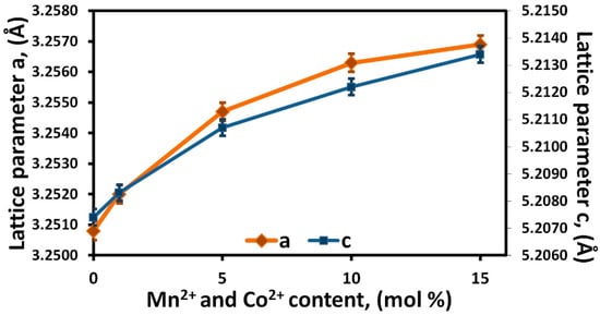 The calculated a and c lattice parameters of Zn(1−x−y)MnxCoyO samples are presented in Table 4 and in Figure 6. The value of both lattice parameters a and c grew in line with the increase in the content of Mn2+ and Co2+ dopants in ZnO (Figure 6). Table 4 also presents the lattice parameters of Zn0.85Mn0.15O NPs and Zn0.85Co0.15O NPs as comparative samples for the Zn0.70Mn0.15Co0.15O sample. According to our assumptions, the principal impact on the value of ZnO lattice parameters was exerted by the dopant with the greater ionic radius since a and c lattice parameters for the Zn0.70Mn0.15Co0.15O sample are comparable to the values for the Zn0.85Mn0.15O sample. The change in a and c lattice parameters in the obtained Zn(1−x−y)MnxCoyO samples proves an effective substitution of Zn2+ ions with Mn2+ and Co2+ dopant ions in the ZnO crystalline lattice. Similar dependencies on changes to Mn‒Co codoped ZnO lattice parameters were described by Adbullahi et al. [].