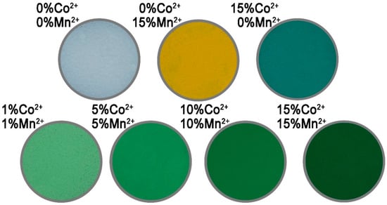 It is generally known that ZnO codoping with Mn2+ and Co2+ ions causes a change in the optical properties and a reduction of the band gap width [,]. Figure 7 and Figure 8 present a visual comparison of changes in the colours of Zn(1−x−y)MnxCoyO samples depending on the content of dopants, while Table 7 summarises the results of the analysis of colours by the RGB and HSL colour models. ZnO codoping with Mn2+ and Co2+ ions resulted in a change of sample colour from light green to dark olive green. A similar change of Zn(1−x−y)MnxCoyO powder colours is reported by Yin-Hua et al. []. The colour of the codoped ZnO is a resultant of the impact of the presence of two dopants in the ZnO crystalline lattice. Our earlier studies [,] showed that ZnO doped with Mn2+ ions changes colour from yellow to orange (Figure 7c) when the quantity of the Mn2+ dopant increases, while Co-doped ZnO NPs are green and the intensity of the colour depends on the content of the Co2+ dopant (Figure 7b). Based on the impact of a single dopant on the colour of ZnO, it can be inferred that the green colour of Zn(1−x−y)MnxCoyO is attributed mainly to the presence of the Co2+ dopant. The modification of the colour of ZnO NPs through their codoping permits the application of Zn(1−x−y)MnxCoyO nanopowders as colourful pigments. Obviously, when using Zn(1−x−y)MnxCoyO NPs as pigments, their applications should be selected such that their potential toxicity is irrelevant.