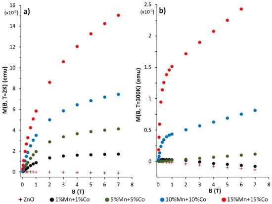 - Yakout, S.M.; El-Sayed, A.M. Synthesis, Structure, and Room Temperature Ferromagnetism of Mn and/or Co Doped ZnO Nanocrystalline. J. Supercond. Nov. Magn. 2016, 29, 1593–1599. [Google Scholar] [CrossRef]