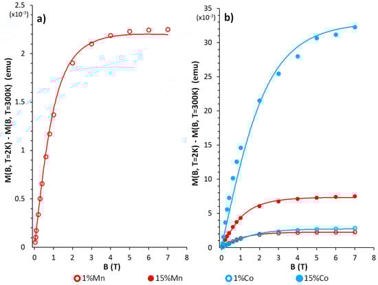 The results of our earlier studies [,] proved that the lattice parameters a and c in ZnO change in line with the change in Co2+ or Mn2+ ion content, which we explained with the impact of changes in the values of ion radii of dopants in relation to Zn2+. However, each dopant gave rise to a distinct change in the value of the lattice parameters of doped ZnO depending on the content and type. For Co2+ dopant ions, whose ion radius is almost identical to that of Zn2+, the value of a lattice parameter in Zn(1−y)CoyO samples grew in line with the increase in the dopant content from 1% to 15% []. The value of the c lattice parameter, in turn, grew when the nominal dopant content ranged from 1% to 5%, and dropped when the content was 5 to 15%. In the case of the dopant of Mn2+ ions, where their ionic radius is greater than Zn2+ radius by as much as 0.09 Å, both lattice parameters, a and c, in Zn(1−x)MnxO samples increased their values within the dopant content range of 1 to 25 mol % [].