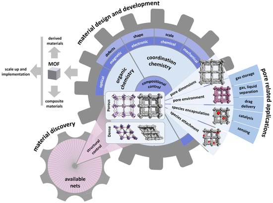 Landscape for metal–organic framework (MOF) research areas, from discovery and design to applications.