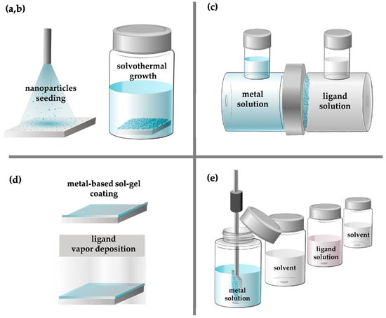 - Virmani, E.; Rotter, J.M.; Mahringer, A.; von Zons, T.; Godt, A.; Bein, T.; Wuttke, S.; Medina, D.D. On-surface synthesis of highly oriented thin metal-organic framework films through vapor-assisted conversion. J. Am. Chem. Soc. 2018, 140, 4812–4819. [Google Scholar] [CrossRef] [PubMed]