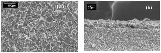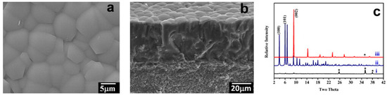 SEM images of the MOF-5 membrane: (a) top view; and, (b) cross-section (adapted with permission from ref. [56]).