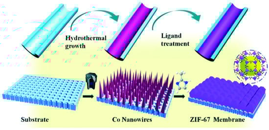 Schematic illustration of the preparation of a pure ZIF-67 membrane by the self-conversion of carbonate hydroxide nanowire arrays (Co-NWAs) (adapted with permission from ref. [81]).