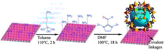 A covalent functionalization methodology was reported by Caro et al. for fabricating ZIF-90 and ZIF-22 membranes by means of APTES (3-aminopropyltriethoxysilane), which acts as a covalent linker between the MOF layer and the support (Figure 6) [82,83]. In this case, the APTES ethoxy functional groups reacted with the Al2O3 support surface–OH groups, and subsequently on the resulting exposed NH2 groups on the support surface, providing nucleation sites for the MOF growth through reaction with the MOF exposed aldehyde groups from the organic linker, and through an imine condensation reaction [82].