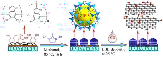 The functionalization of the support with a polymer layer is another approach that has been applied by Caro et al. via the immersion of the Al2O3 supports in an aqueous-buffered solution of dopamine at room temperature. At pH 8.5, the dopamine spontaneously polymerizes into polydopamine (PDA) and it forms a thin layer on the Al2O3 surface [84,85]. Subsequently, the ZIF-8 membrane was grown by the in situ solvothermal method onto the PDA-modified macroporous stainless steel nets [85]. Post-synthetic membrane modification with graphene oxide (GO) has proven to be able to seal intercrystalline defects, and in a later study, Caro et al. obtained a better performing ZIF-8 membrane supported on a polydopamine-functionalized support (Figure 7) [86].