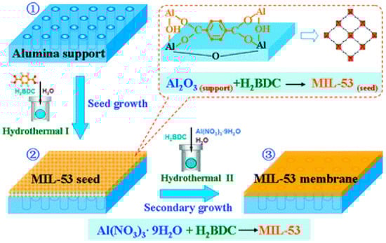 Schematic diagram of preparing the MIL-53 membrane on an alumina support via the reactive seeding method (adapted with permission from ref. [91]).