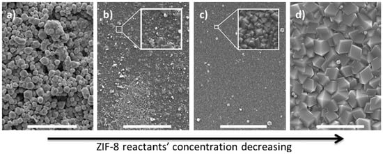 SEM surface images of ZIF-8/PTSC membranes prepared with different reactant concentrations: (a) M1, (b) M2, (c) M3, and (d) M4. Scale bar: 10 mm (adapted with permission from ref. [95]).