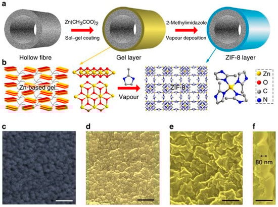 A gel–vapor deposition (GVD) method was introduced by Zeng et al. for MOF membranes fabrication. The method is based on combining a free sol–gel coating with a solvent-free vapor deposition [96]. Through this method, a better control over the thickness of MOF membranes can be achieved and, in some cases, a 20 nanometer-thick MOF membrane can be fabricated via the variation of sol concentrations and coating techniques. This method proved to bring several advantages like; the no need for pretreatment of supports prior to growth, compatibility between MOF and supports, low cost via the possibility to reuse MOF precursors, the facile handling of MOF layers locations, and shortening the time of fabrication. The GVD approach was applied to grow ultrathin ZIF-8 membranes by using a sol precursor, which is Zn-based, prepared via the mixing of zinc acetate dihydrate precursor and ethanolamine base in ethanol solvent. This support was then coated with sol precursor of 1 U concentration (in this study 1/3 g mL−1 of zinc acetate dihydrate/ethanol sol was defined as one concentration unit (U)) and thermally treated to form the Zn-based gel. Later on, this gel thin film was converted to the MOF membrane by the deposition of the ligand vapor by heating (Figure 13a). In this process, the produced ligand vapor reacts with the sensitive Zn-based gel thin film that leads to the crystallization of the MOF (Figure 13).